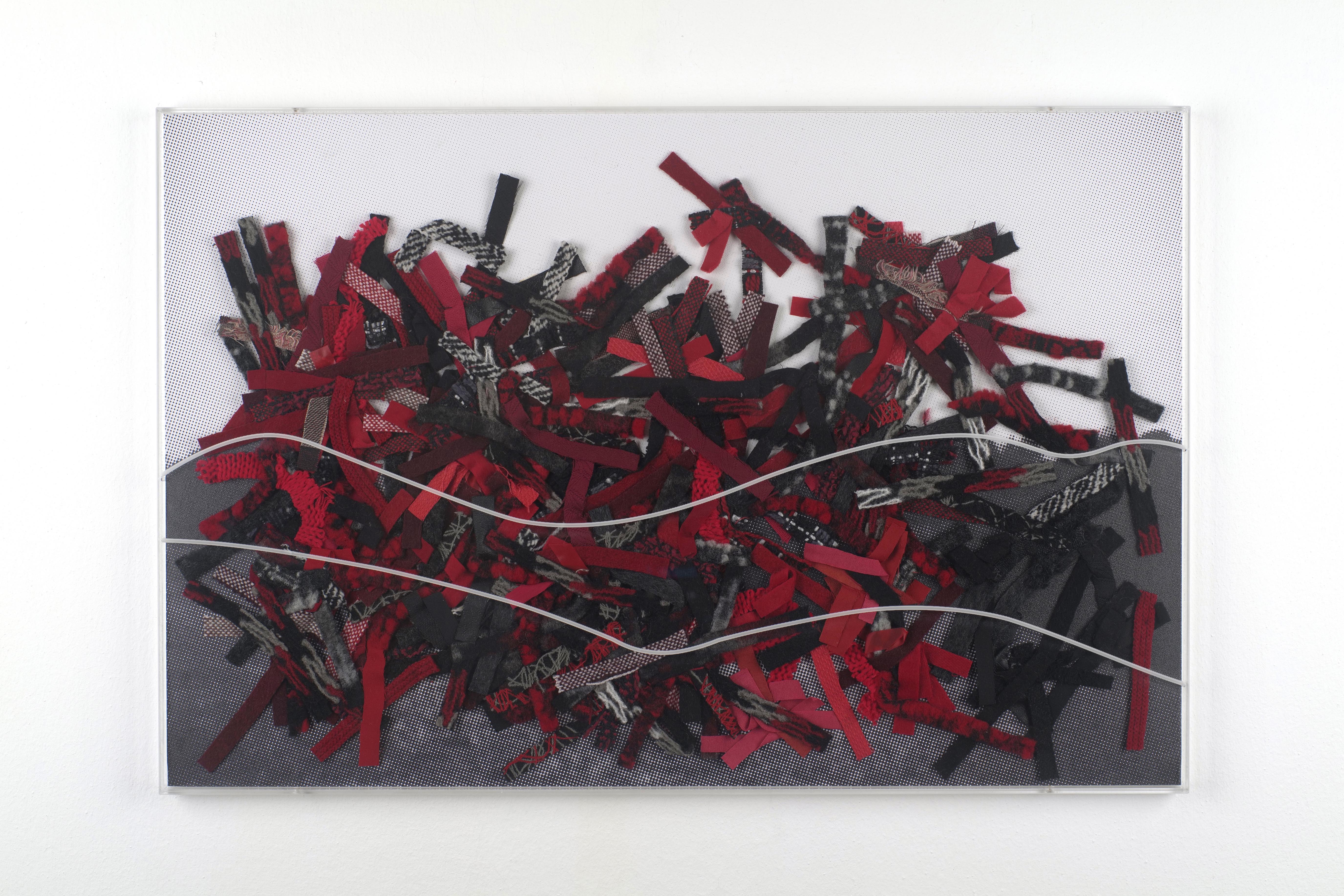 , A series of five photographs, 60 × 40 cm each, pigment print on photography paper, overlapped textile waste, enclosed in a laser-engraved acrylic glass frame, ©Bildrecht Vienna 2025